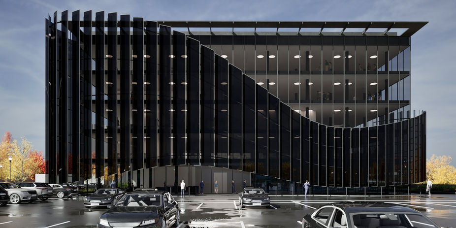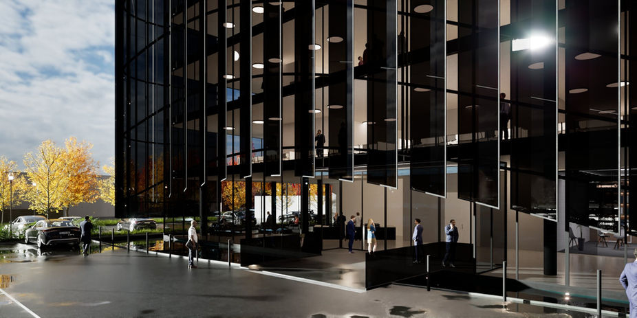 Edificio direzionale a forte impronta contemporanea, caratterizzato da un volume compatto avvolto da una pelle vetrata continua. La facciata è scandita da lamelle verticali scure, disposte con andamento dinamico e curvilineo, che funzionano come brise-soleil e definiscono un’immagine iconica e riconoscibile.